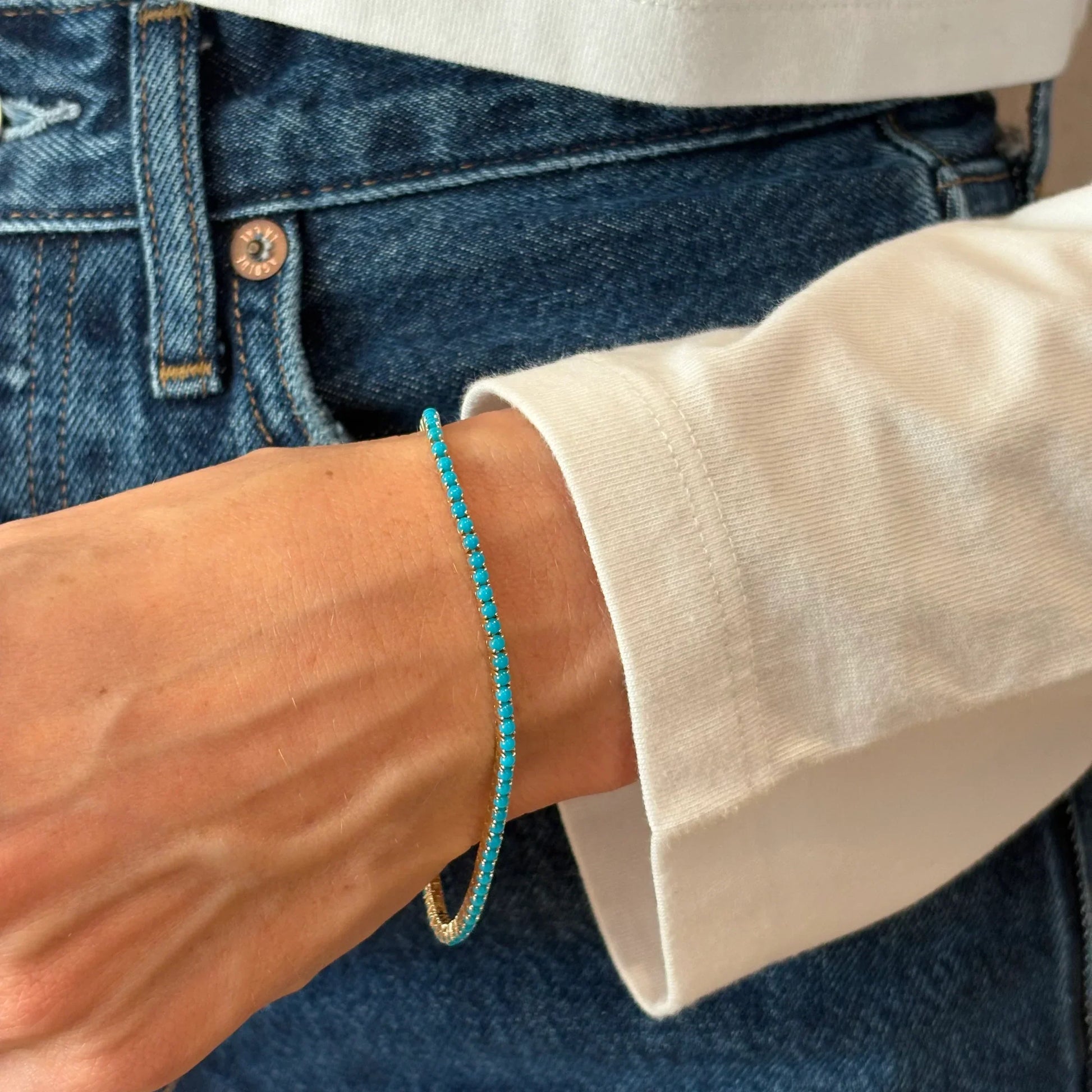 Western roots meet modern shine — the LUNERA Dakota Turquoise Tennis Bracelet blends timeless charm with contemporary elegance, creating the ultimate stack-and-style essential.